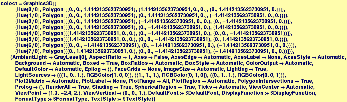 The object coloct is defined below to draw an octahedron and it invokes the Polygon function to draw the triangular faces by connecting three points at specific numerical coordinates. Note that each triangles' three vertices are each specified by a vector.