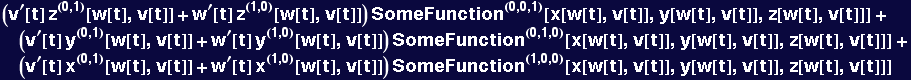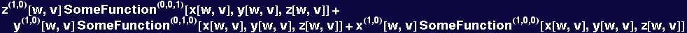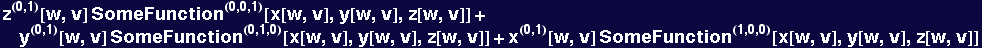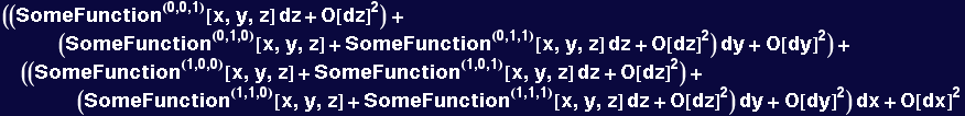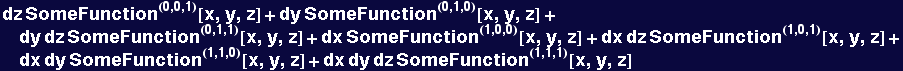 In the output lines above, partial derivatives are denoted by superscripts: e.g., (1,0,0) indicates the first partial derivative with respect to the first variable, x. The second partial with respect to y and z would be denoted by a superscript (0,1,1).