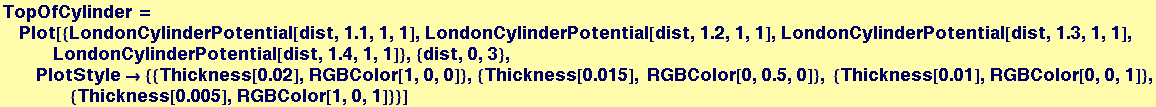 The plot above shows the London potential vs. radial distance for z values equal to and larger than the cylinder height. The cylinder height is 1 and its radius is 1;.the potential is plotted for z = 1.1, z = 1.2, z = 1.3, and z= 1.4. All these z values are beyond the end of the cylinder, and the potentials do not diverge at dist = 1. Note that unlike the previous plots, this one extends from dist = 0 to 3.